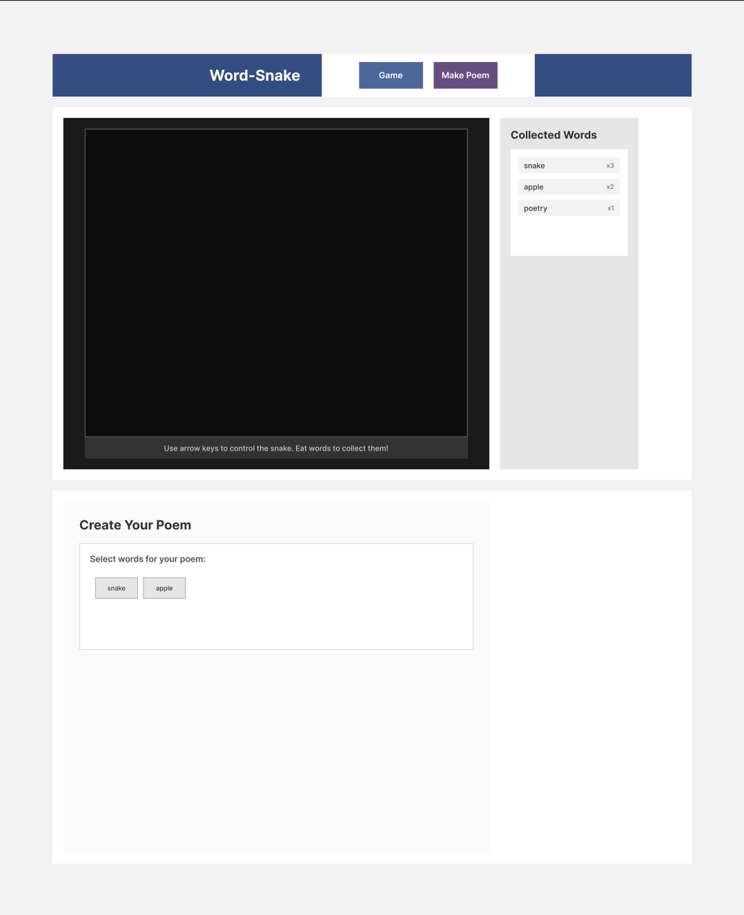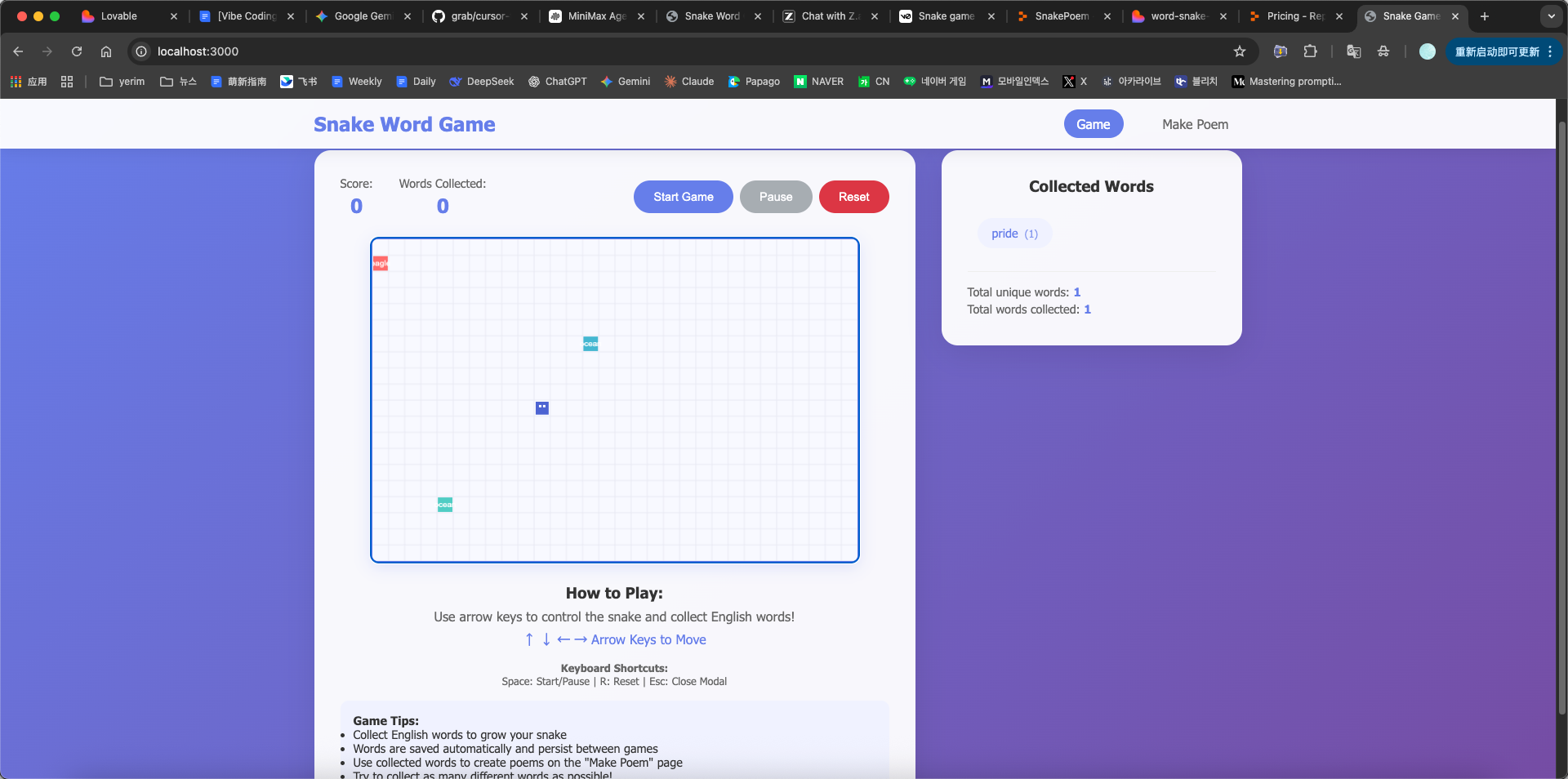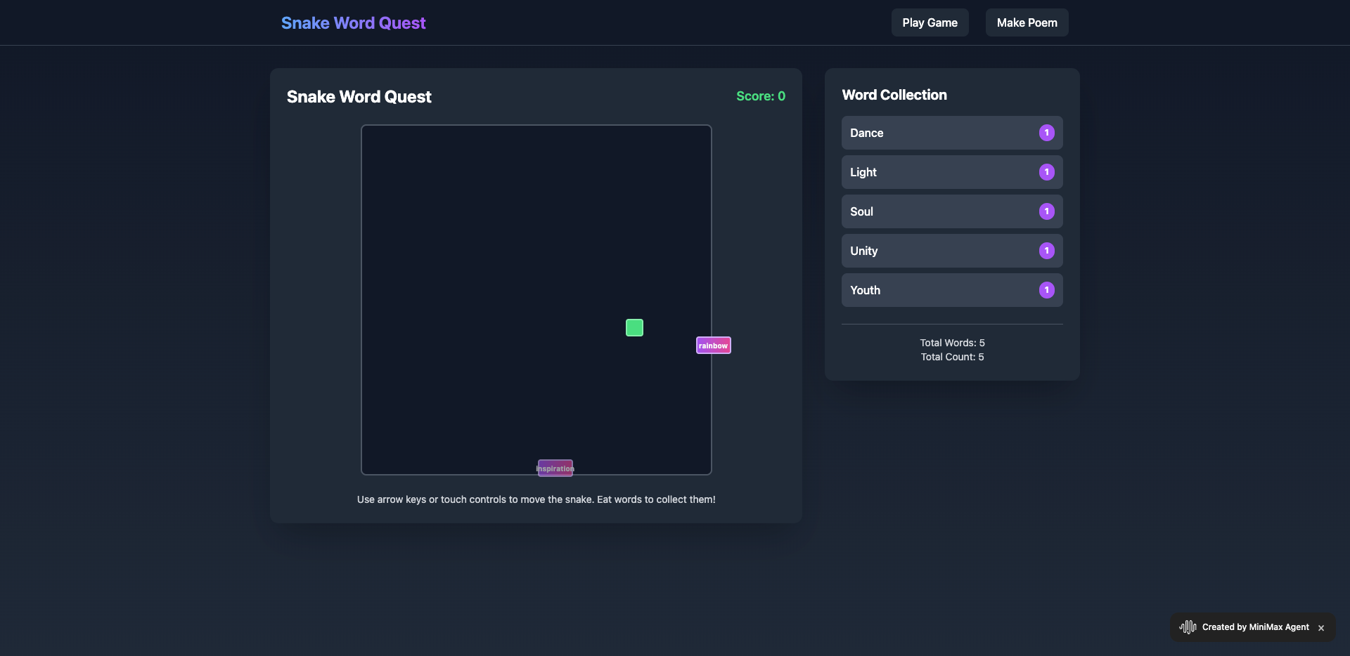 - 单词收集机制(单词出现在棋盘上,蛇吃掉单词后,侧栏列表更新)。