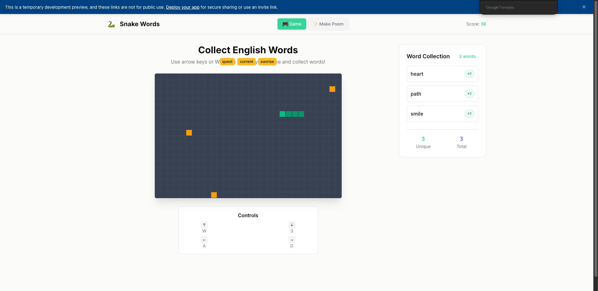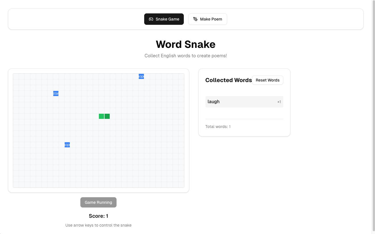 - 蛇吃掉的是英文单词,收集到的单词会在游戏结束后保留,并在新一局中继续使用。相同单词可以被多次收集,并分别计数。