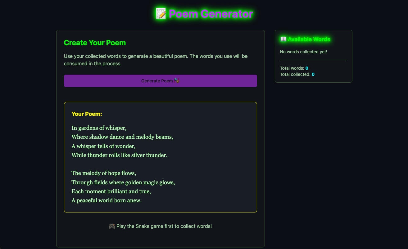 - “生成诗歌”按钮:点击后调用后端,显示诗歌,并根据使用情况更新单词库存。