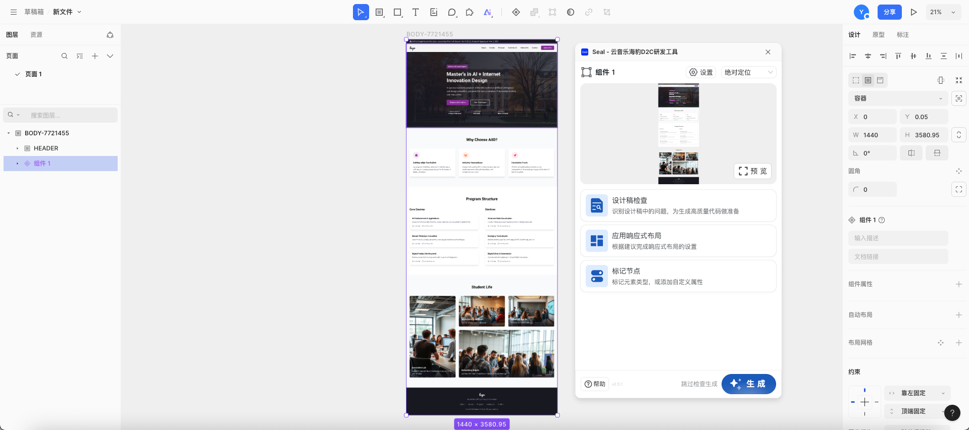 - 选中你想转换为代码的设计区域,点击 Generate 按钮生成代码。