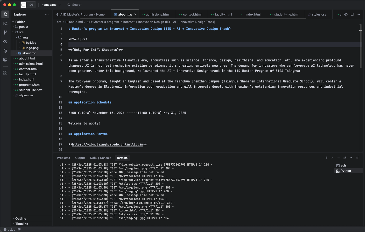 如果你想加入特定图片(例如 Logo、背景图等),可以先把图片上传到项目文件夹中,然后在提示词里说明要在页面的什么位置使用这些图片。