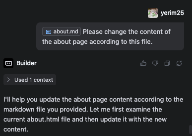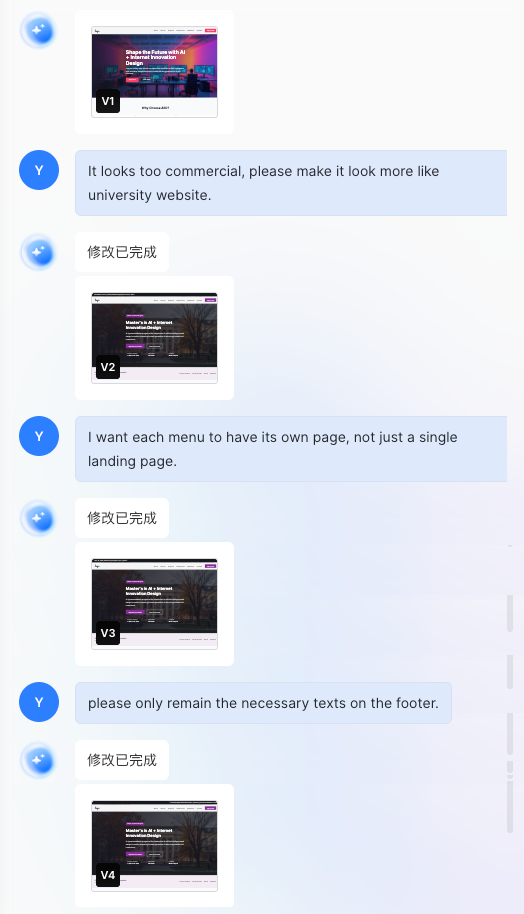 Agent 生成的初版网站,通常会包含一些自动生成的占位文本。为了让它更贴近你的真实场景,你可以提前准备好实际内容,再让 Agent 帮你替换。