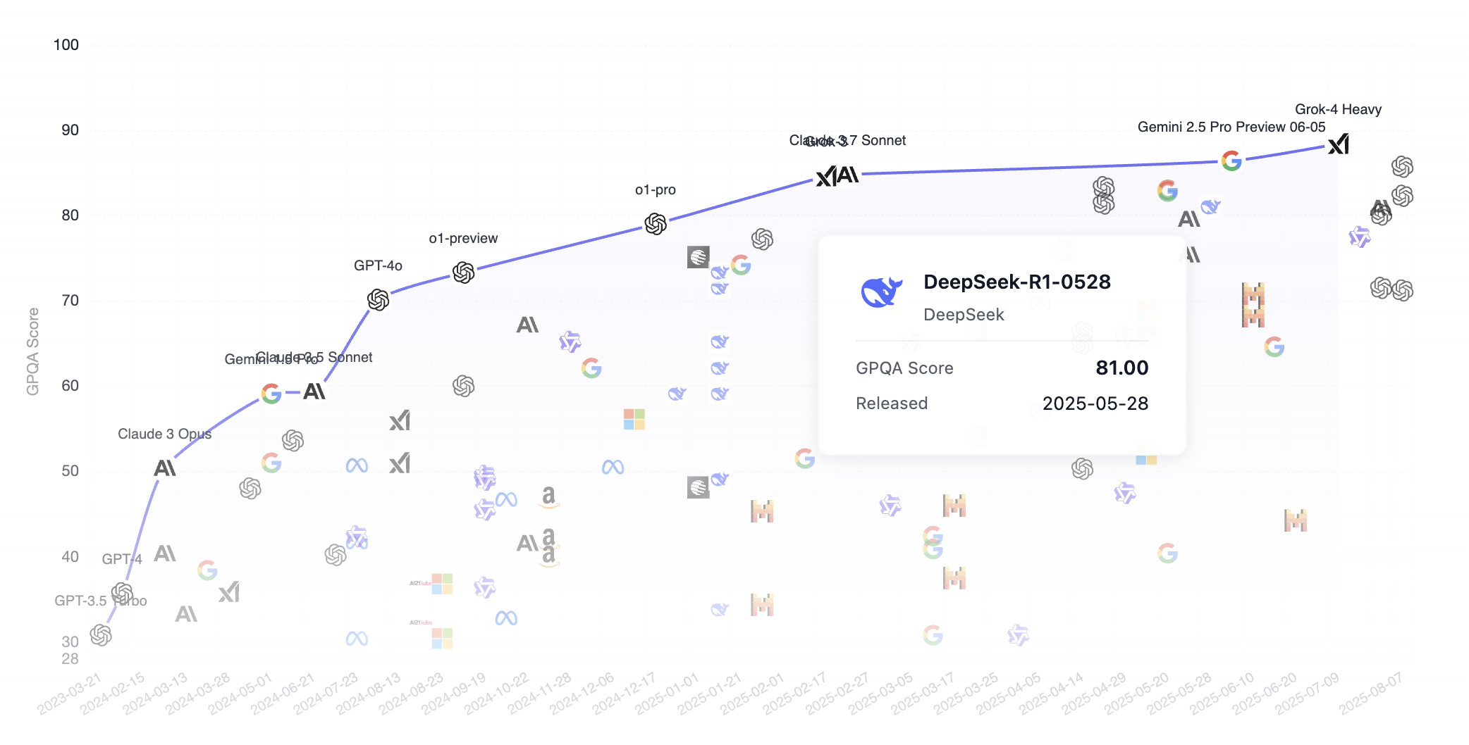 让我们看看 DeepSeek 在 GPQA 基准排名中与其他顶级模型的表现对比。值得注意的是,DeepSeek 是一个开源(每个人都可以从互联网下载模型)模型,而其他常见模型如 Grok、Google Gemini 和 ChatGPT 都是闭源的。正如我们所见,DeepSeek 已经很大程度上接近了第一梯队的模型。