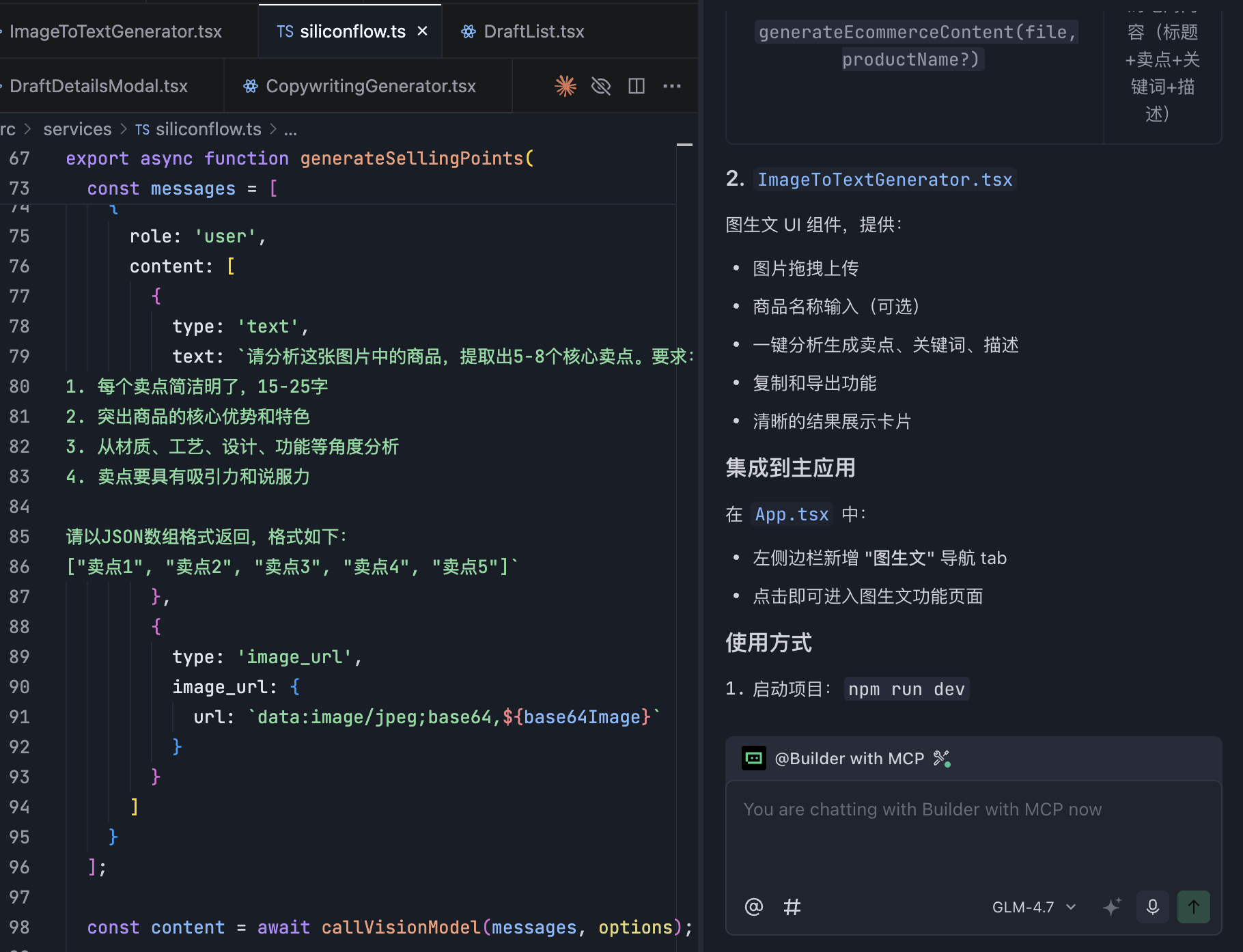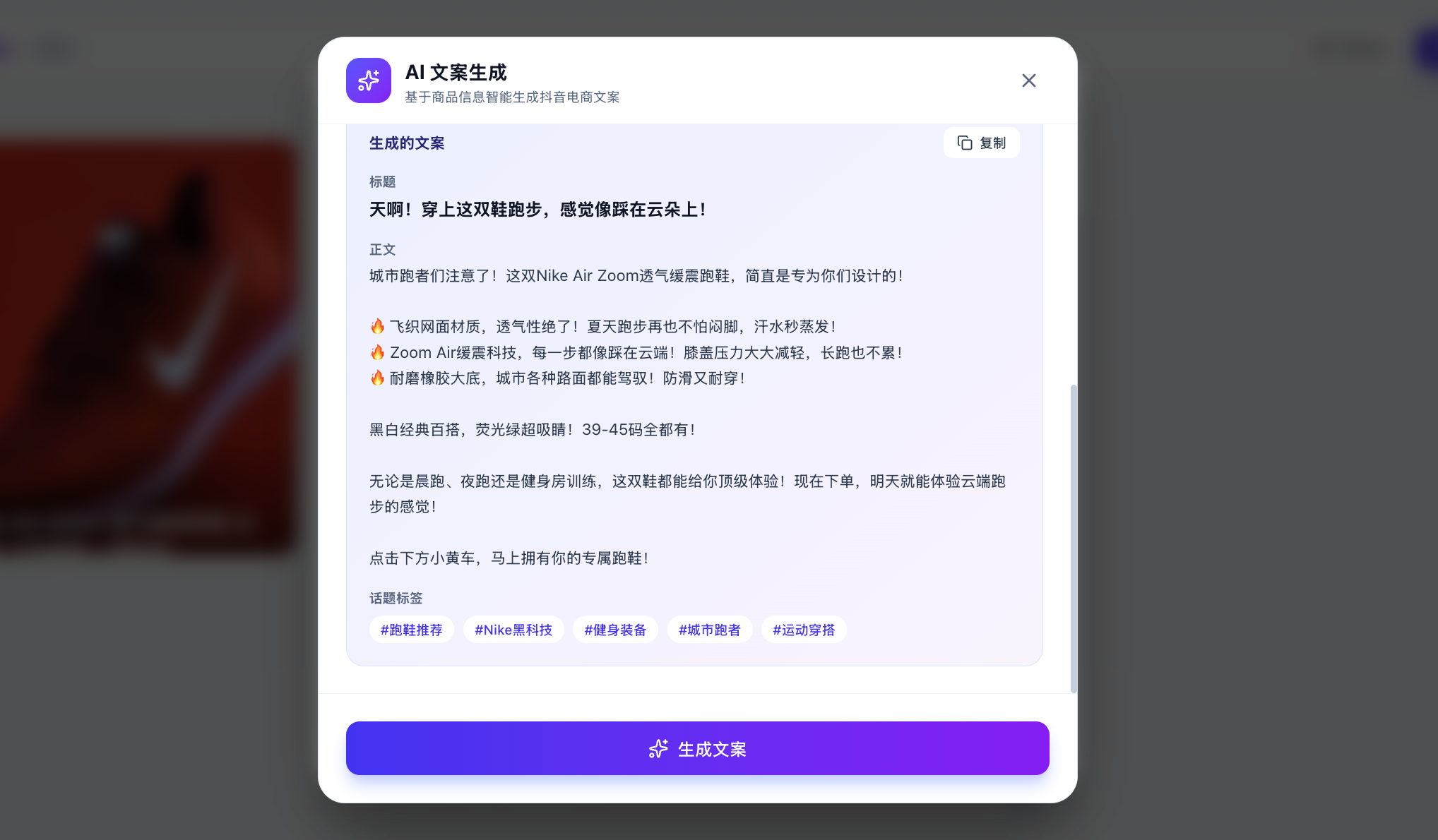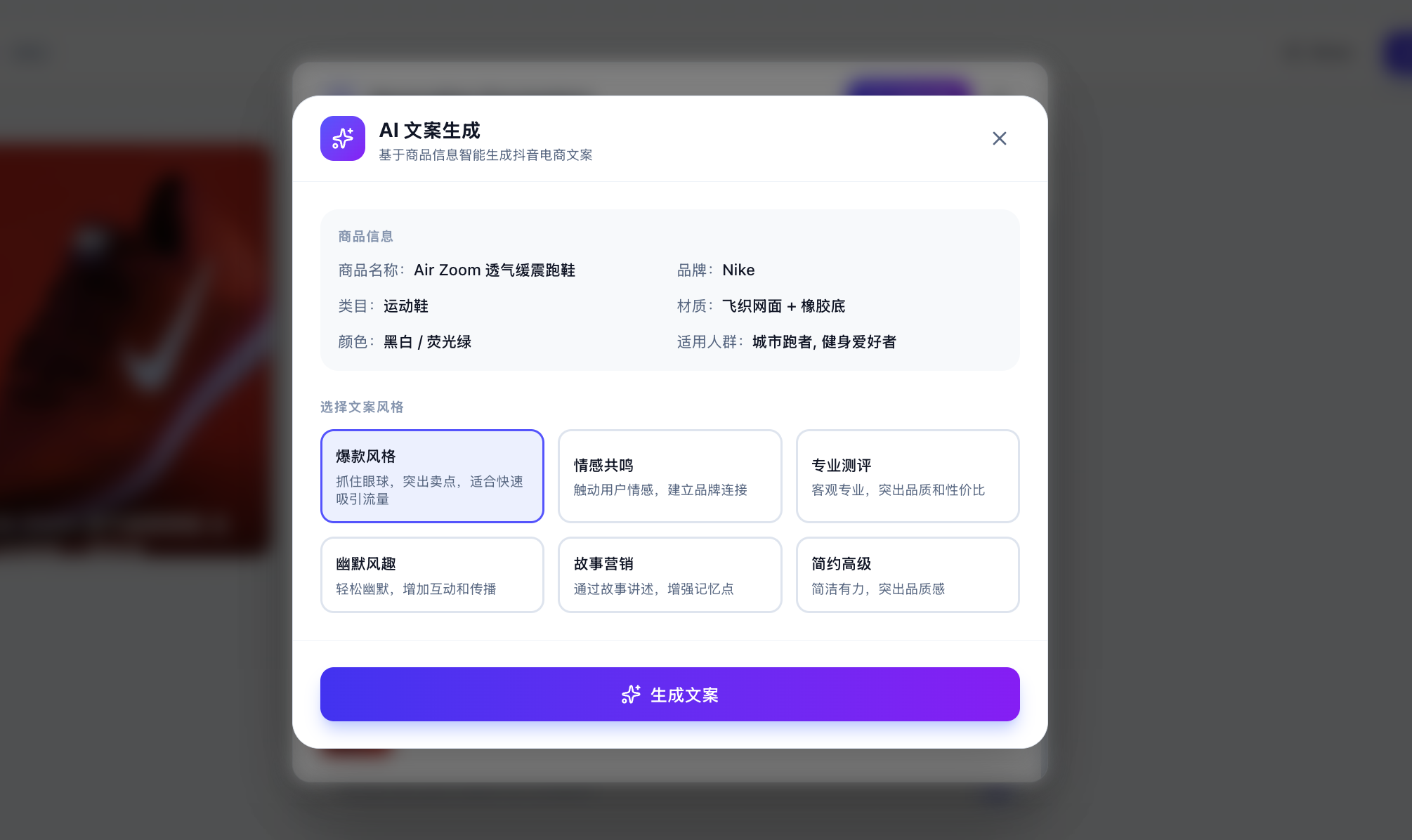 参考这个调用方法,帮我支持文案生成功能,可以基于商品信息点击后生成对应抖音电商文案,多种风格。