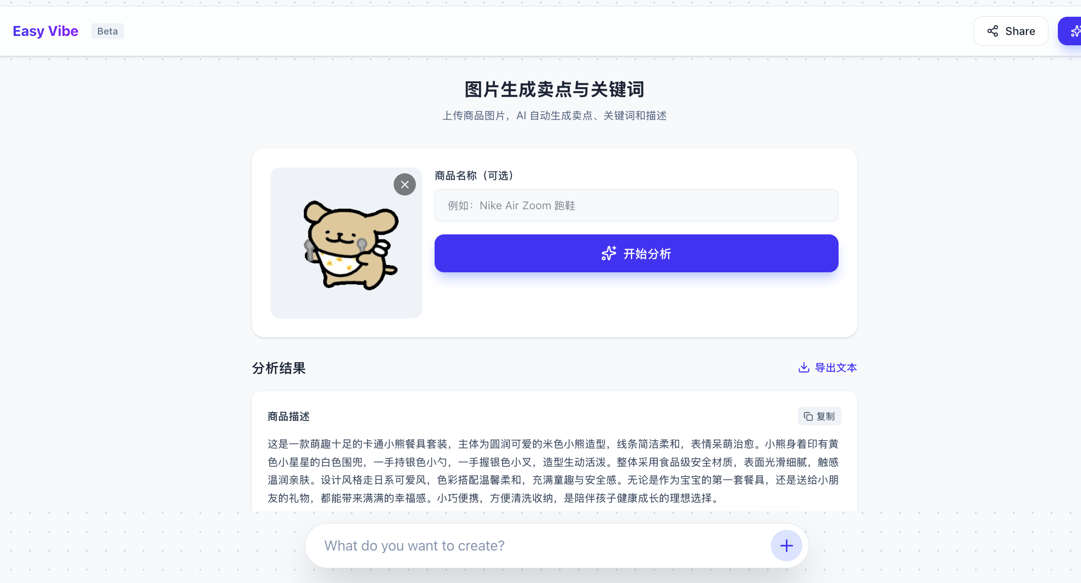 }'经过一段时间的 AI 代码生成,我们很容易得到对应的文案生成按钮进行测试,如果你找不到入口,可以让 AI IDE 告诉你从什么页面可以点到该页面,如果实在找不到,可以让 AI IDE 直接基于你的想法重构改进,得到最后的文案生成结果。
