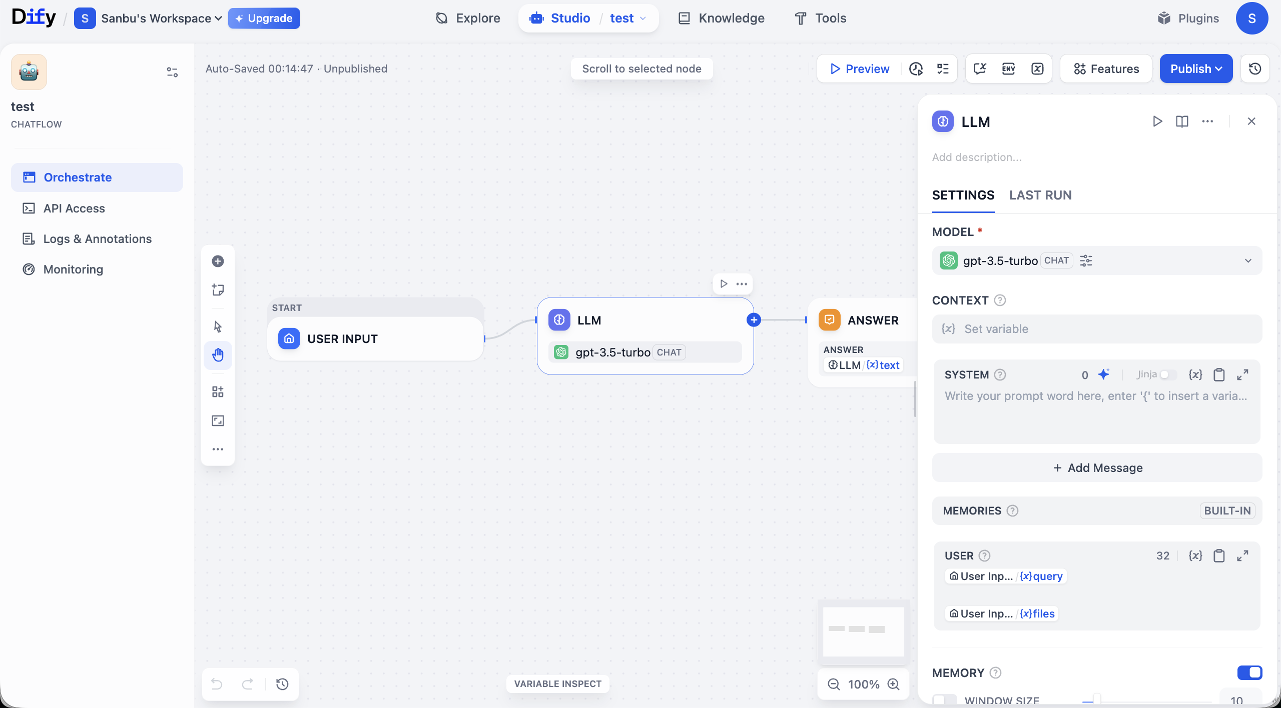 这种做法带来了多重价值:非技术人员(如产品经理或运营)可以通过拖拽组件快速搭建 AI 应用;开发者可以将 RAG 检索、LLM 调用、API 工具等封装为标准节点,在不同业务场景中复用;整个流程还可被完整追踪、调试和持续优化,满足企业对稳定性与合规性的要求。