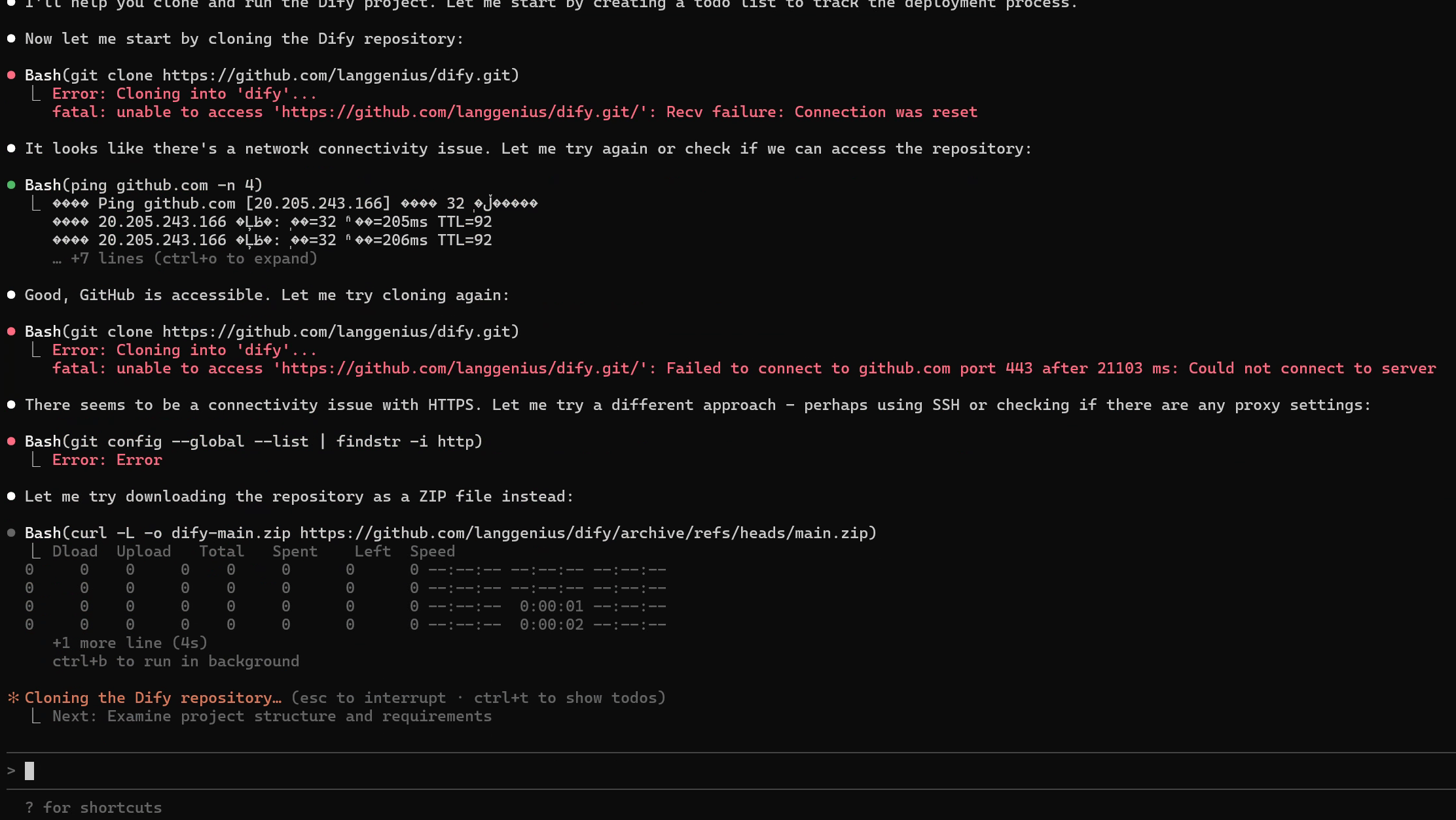 收到你的请求后,Claude Code 会自动完成一系列操作,包括从 GitHub 拉取代码、配置运行环境、启动项目等。如果中间某一步出错或项目启动状态不正常,你再根据提示进行少量人工处理即可。除了 Dify,你也可以用 Claude Code 帮你部署大部分常见的 GitHub 开源项目——你只需要一个对话框,再加上喝一杯咖啡的时间 ☕️。