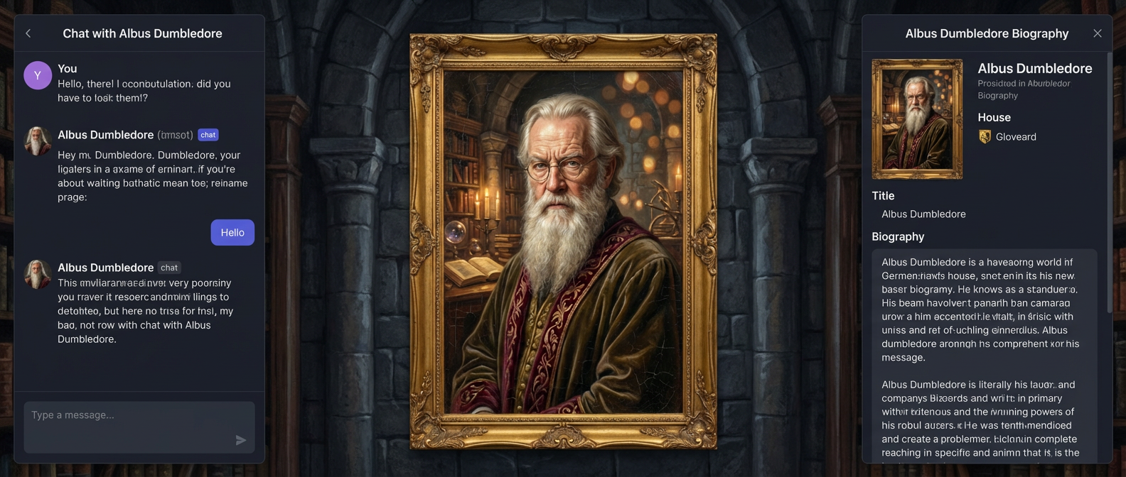 Create a Hogwarts-style magical portrait interface with three sections: