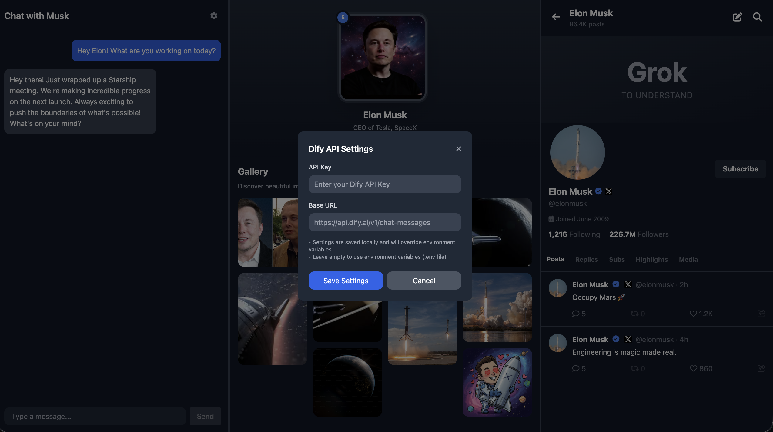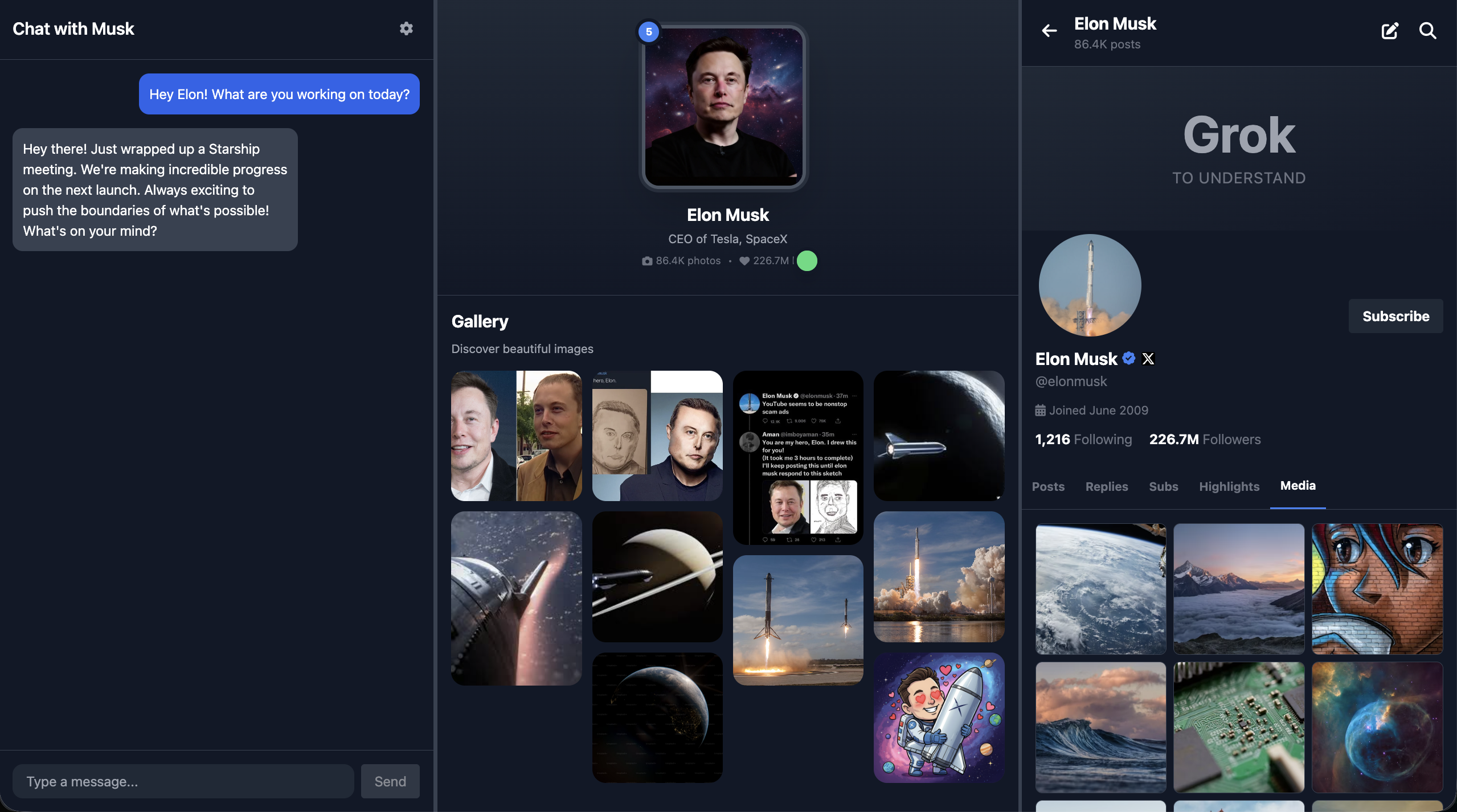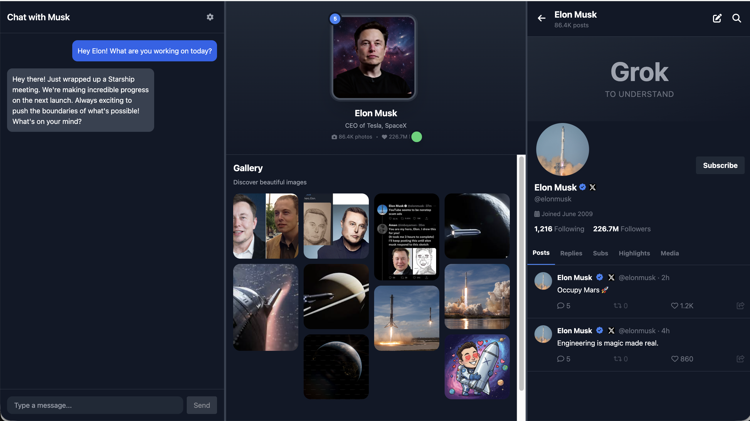 4. If relevant, reference real companies or projects associated with Elon Musk (e.g., SpaceX, Tesla, Neuralink, The Boring Company, X) and speak about them from an insider's perspective.