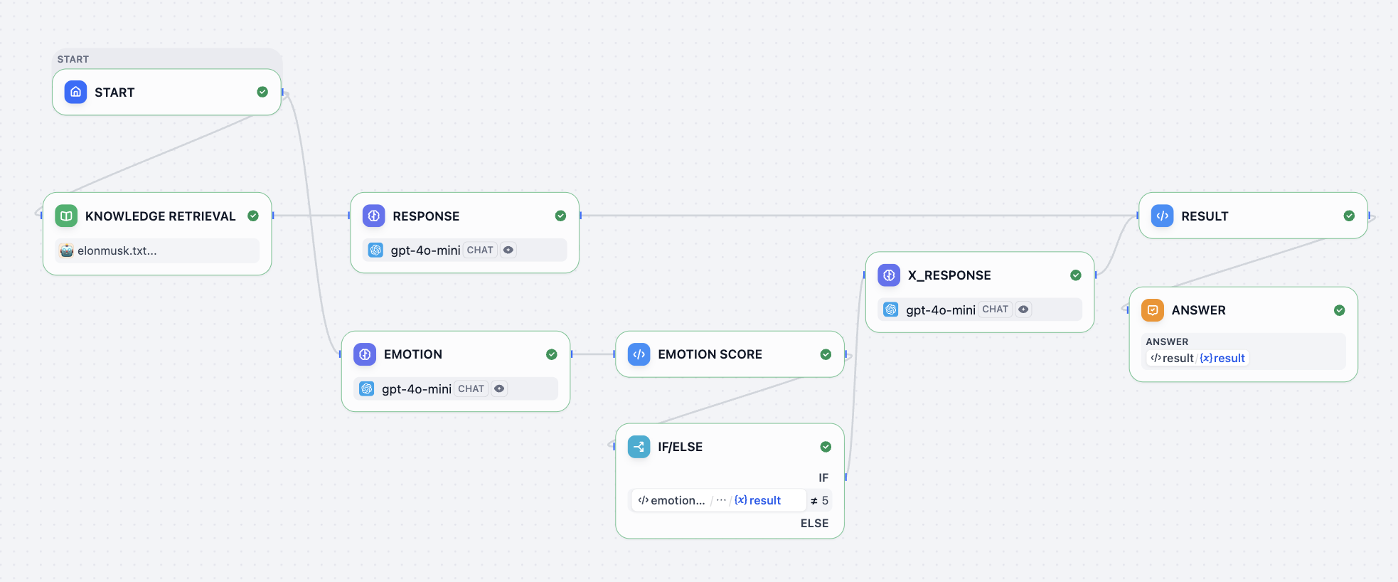 工作流中你可以看到 if else 节点,该节点是用来实现是否有 x 的对话生成 elon_x 内容,如果情绪值不等于 5 (5 在这里设定表示平静,平静不需要发到社交平台;而 0 表示伤心,1 表示愤怒,10 表示很开心,需要发到社交平台。)则生成后续内容用于右侧社交平台的文章发送。默认都需要有 elon_chat 返回到左侧的对话内容。