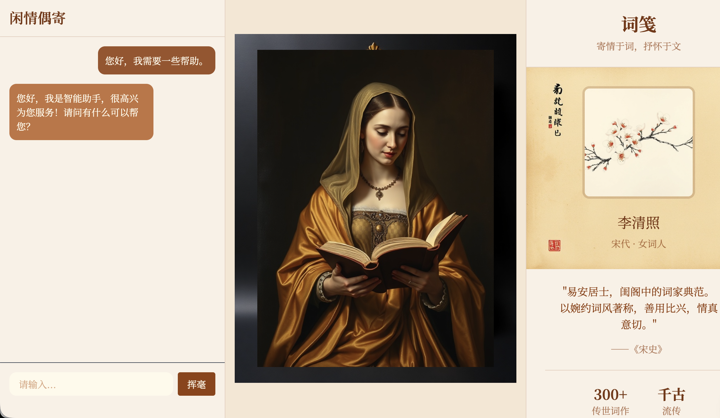 完成第一版设计后,我们不必局限于此,鼓励大家快速探索更多元的视觉风格。你可以在原型部分进行大胆的修改,又或者是基于最后的项目进行全新提示词的修改,从而生成多套风格差异显著的页面。 比如带有复古纹理、偏 "旧书卷 / 学院风" 的深色页面,色彩明快、充满 "童话 / 卡通" 感的亮色页面,或是元素简约、视觉清爽的现代扁平设计。例如下图是一个转换为中国古风诗人设计风格的案例,画像图片未更换,只修改了其他部分: