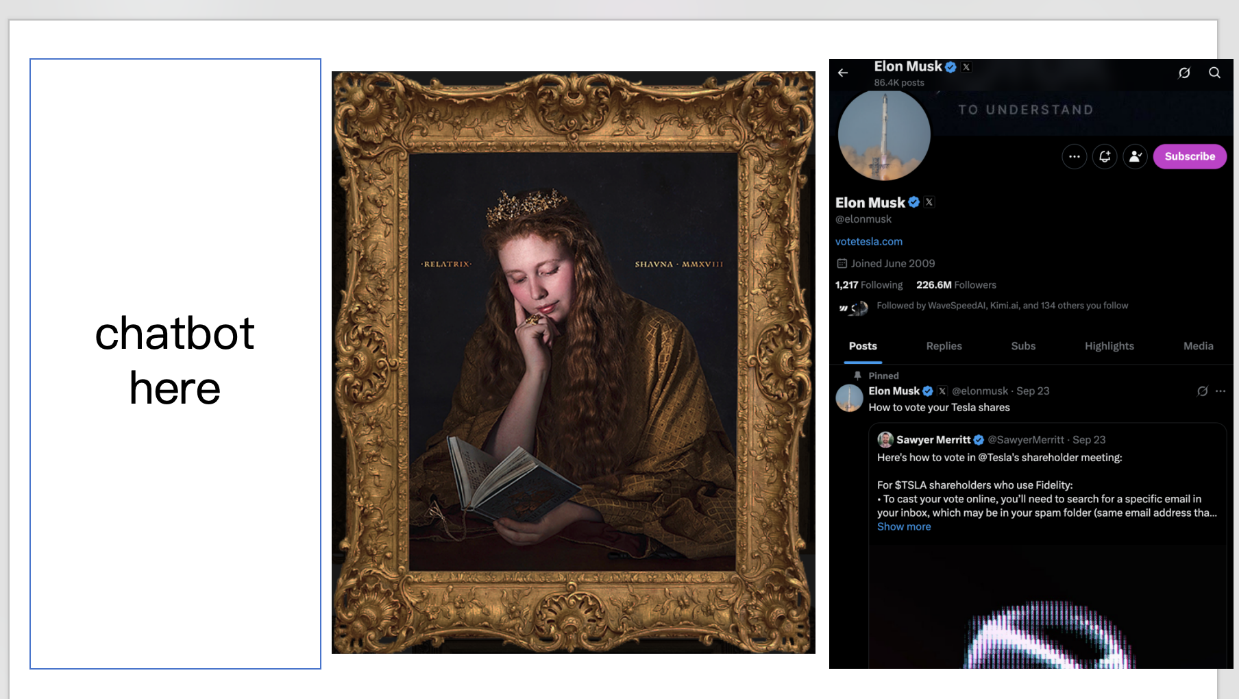 最简单的,我们可以用 PowerPoint 设计最初的网页呈现原型,我们从网上找到一张魔法画像的图片,并且将画面设定为横向排布,最左侧设定为聊天区域,中间是画像区域,最右侧是 X 的区域。