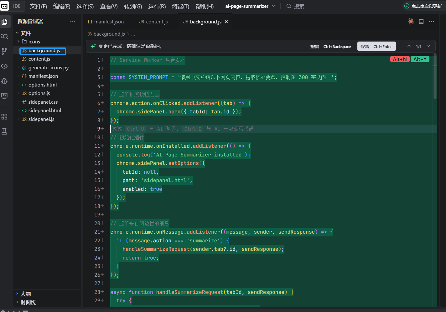 让 AI 帮你在 background.js 中添加内置 AI 的支持: